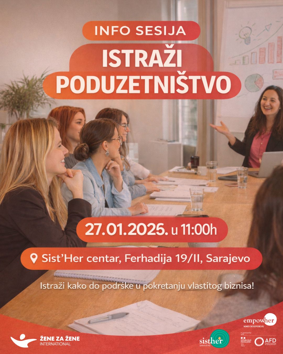 Info sesiju vodi Venesa Omerhodžić Klempić, koordinatorica za poduzetništvo u Udruženju Žene za Žene International, koja ima bogato iskustvo u poduzetničkim projektima sa fokusom na ekonomsko osnaživanje žena.